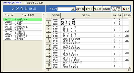 °¡´ÉÇÕ´Ï´Ù. °èÁ¤ÄÚµå º¯°æ½Ã´Â ¾Æ·¡ÀÇ ºÎ¿©±ÔÄ¢À» Âü°íÇÏ¿© ¼öÁ¤ÇϽñ⠹ٶø´Ï´Ù. °èÁ¤ÄÚµå º¸±â (´ÜÃàŰF4) ´ÜÃàŰF4۸¦ ´©¸£¸é °èÁ¤ÄÚµå °ü¸®È¸éÀÌ ÆË¾÷µË´Ï´Ù. ÁÂÃøÀÇ [ÀÚ»ê], [ºÎä], [ÀÚº»], [¼öÀÍ], [ºñ¿ë], [Á¦Á¶] µî ºÐ·ù¹öưÀ» Ŭ¸¯ÇÒ ¼ö ÀÖ½À´Ï´Ù.